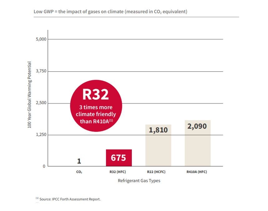 Replacing R410A with R32 refrigerant is one option in line with this protocol and enables significant reductions in CO2 -eq emissions. R32’s impact on global warming is 3 times less than that of R410A.